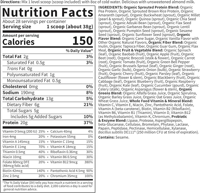 - WHAT’S THE SCOOP: Why have a snack when you can have the whole meal? These all-in-one protein shakes are made for any time of the day: 20g of plant based protein powder will leave you satiated thanks to 6g of fiber in 150 calories per serving