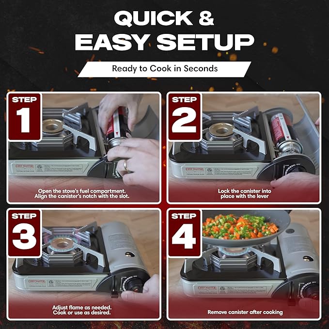 - PREMIUM QUALITY CAMPING STOVE FUEL - Trust Chef Master Premium Performance Butane Fuel for consistent, high-efficiency heat during every outdoor or kitchen cooking task. Specially designed for portable gas stoves, butane torches, and culinary tools, this top-tier fuel is perfect for camping, backpacking, grilling, boiling, and preparing crème brûlée. Each 8 oz. canister delivers clean, reliable performance, making it ideal for food trucks, tailgating, catering events, and emergency kits.