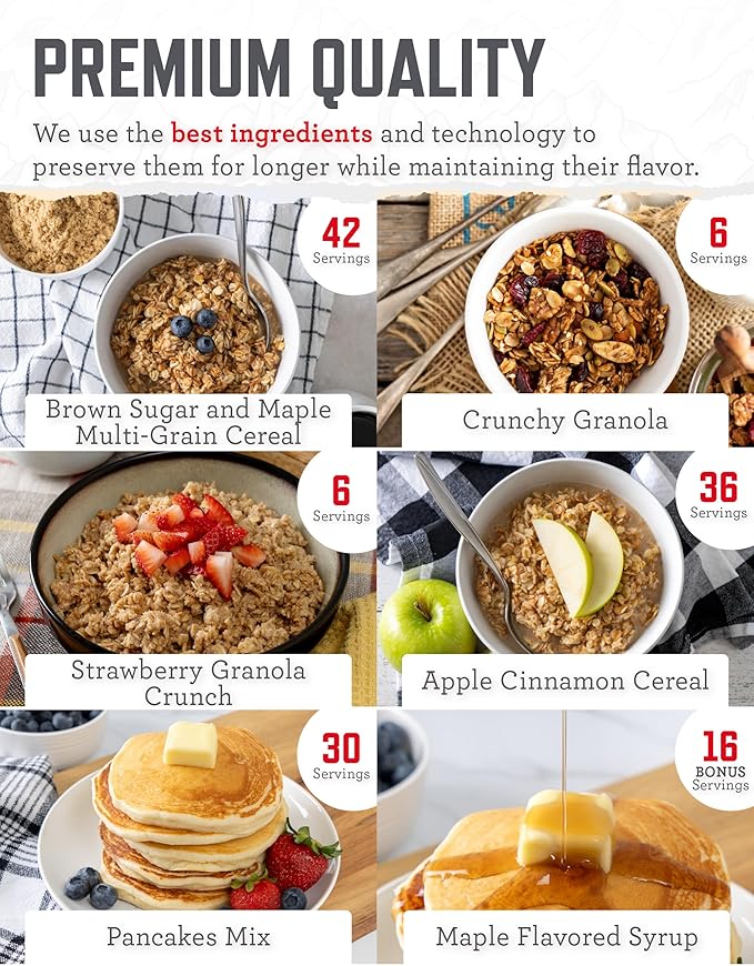 - PREPPER MEALS: Our survival kit offers tasty and nutrient rich options, including Cheesy Macaroni, Lasagna, Pasta Alfredo, Brown Sugar & Maple Multi Grain Cereal, 1 bonus pouch of Maple Flavored Syrup, & more to enhance your outdoor meals reliably.