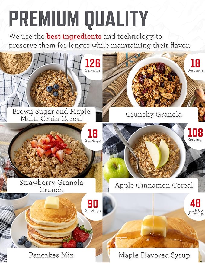 - PREPPER MEALS: Our survival kit offers tasty and nutrient rich options, including Cheesy Macaroni, Lasagna, Pasta Alfredo, Brown Sugar & Maple Multi Grain Cereal, 3 bonus pouches of Maple Flavored Syrup, & more to enhance your outdoor meals reliably.