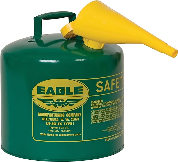 Eagle 5 Gallon Type I Green Safety Gas Can for Oil and Other Combustibles with Flame Arrester, Self-Closing Lid, and F-15 Funnel, Made in the USA, Galvanized Steel Flammable Storage Can, UI50FSG