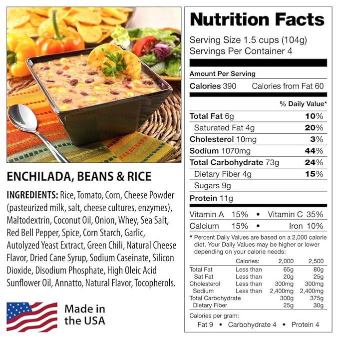 - Made in the USA - Simple to prepare meals: just add water - Perfect for Hiking, Backpacking, Camping, or Long Term Emergency Preparations