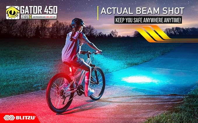 BLITZU Bike Lights Set – Gator 450 LED USB-C Rechargeable Headlight & Rear Taillight with Front and Back Bike Reflectors – Bicycle Accessories for Night Riding, Men & Kids