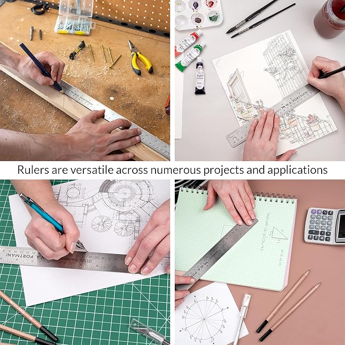 - Precision You Can Rely On – Crafted from durable stainless ruler metal, we designed each small to large ruler to feature deeply etched markings for consistent accuracy. Unlike a fading wood straight edge ruler, this heavy duty steel ruler delivers long-lasting clarity, making it the ideal metal metric ruler for precise, professional-grade measuring every time
