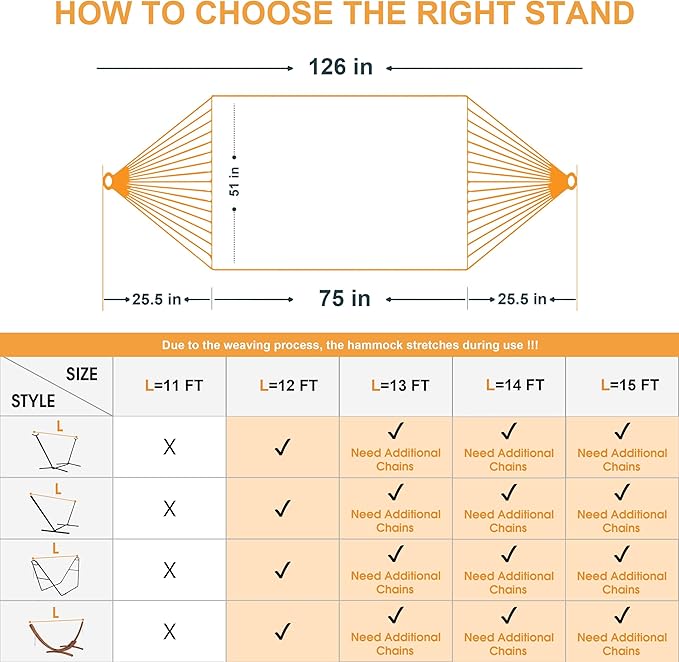- HANGING SOLUTION: The hammock has an overall length of 126 inches and includes two chains. Due to the woven construction, the hammock stretches during use, so a 13-15 FT hammock stand is required. It can also be hung between trees, with a recommended hanging height of 60-66 inches and a tree spacing of 156-240 inches. The adjustable chains allow for customizable comfort