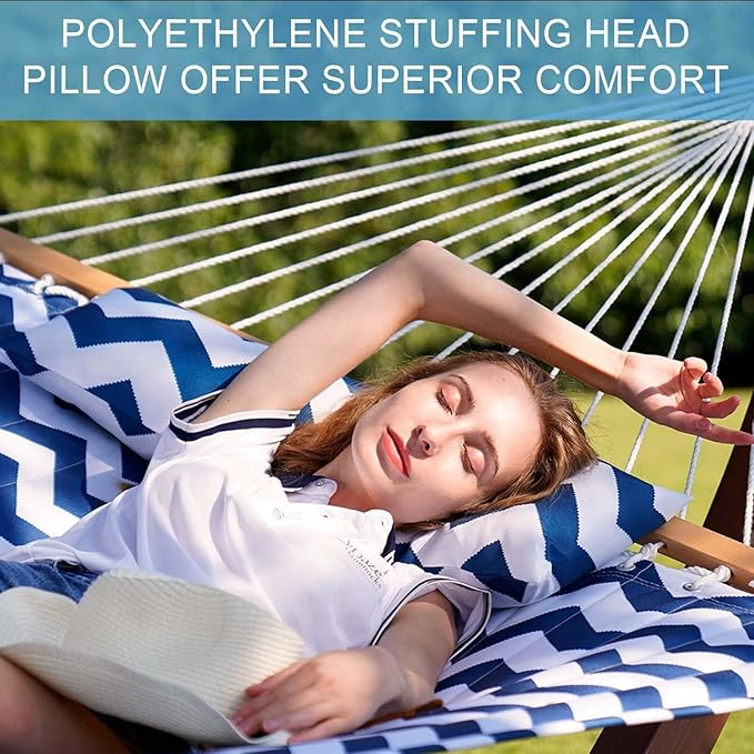 Lazy Daze Hammocks 12FT Quilted Fabric Double Hammock with Spreader Bars and Detachable Pillow, 2 Person Hammock for Outdoor Patio Backyard Poolside, 450 LBS Weight Capacity, Blue Chevron Stripe