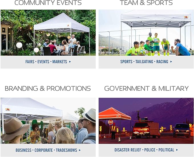 - [Packing and Warranty] Package includes premium pop up canopy frame + canopy tent top + roller bag + 4 weight bags+ 4 ropes+ 4 stakes. One year after-sale protection for frame, six months after-sale protection for fabrics and accessories. This is definitely most professional and durable pop up canopy. Satisfy all your professional need. If you have anything about our products, we are ready to help you.