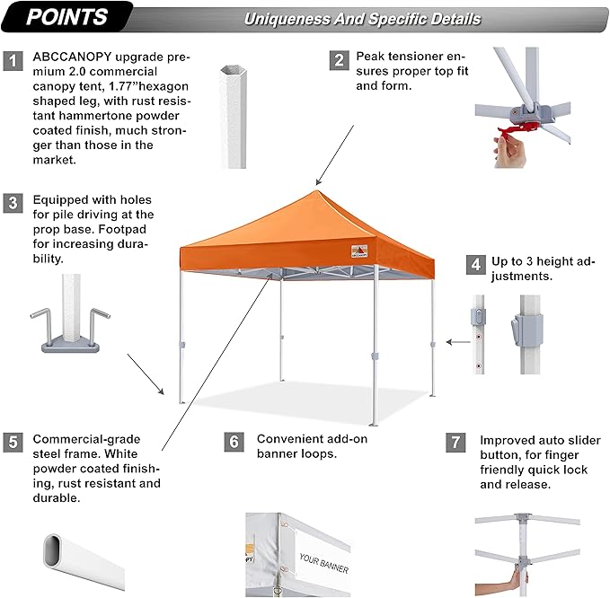 - [Highlight and Technology] (1)Special designed peak tensioner design, lift the top higher to ensure the top tight and firm. Will not collected water in rainy days. Beautiful and Safety.(2)ABCCANOPY oversize designed roller bag allow you to easily put frame and top inside. The flexible big wheels, conveniently and smoothly. Satisfy your need and long lasting.