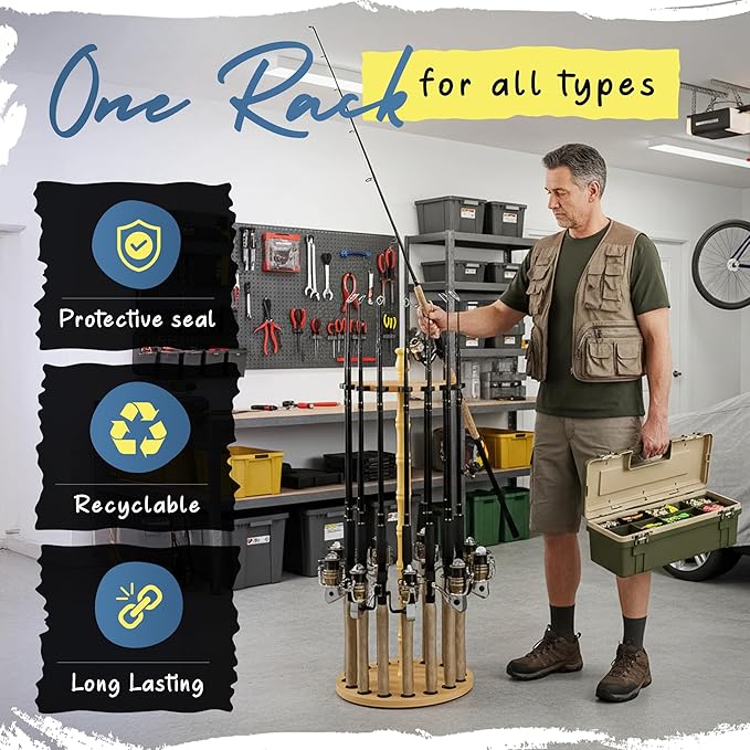 Rush Creek Creations Round 16 Fishing Rod Storage Rack - Features Traditional Handcrafted Wood Post - No Tool Assembly, Wood Grain Laminate