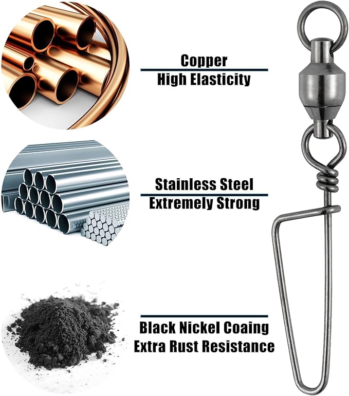 - PREMIUM MATERIAL: Ball bearing swivel made with high quality copper, snap and ring made with enhanced stainless steel. Full body coated with black nickel coating for incredible strength and durability.