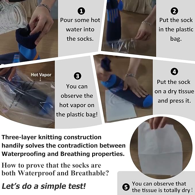 - Comfortable: These seamless, waterproof-breathable socks keep your feet dry and comfortable in wet conditions without adding bulk or sacrificing comfort – no plastic bag feeling. Three layers structure not only ensures optimal shock absorption, but also protects your feet from the disturbance of mosquitoes and bugs. Reinforced heel & toe provide outstanding durability. Seamless design minimizes friction and no worry about blisters come to your feet after all-day wear.