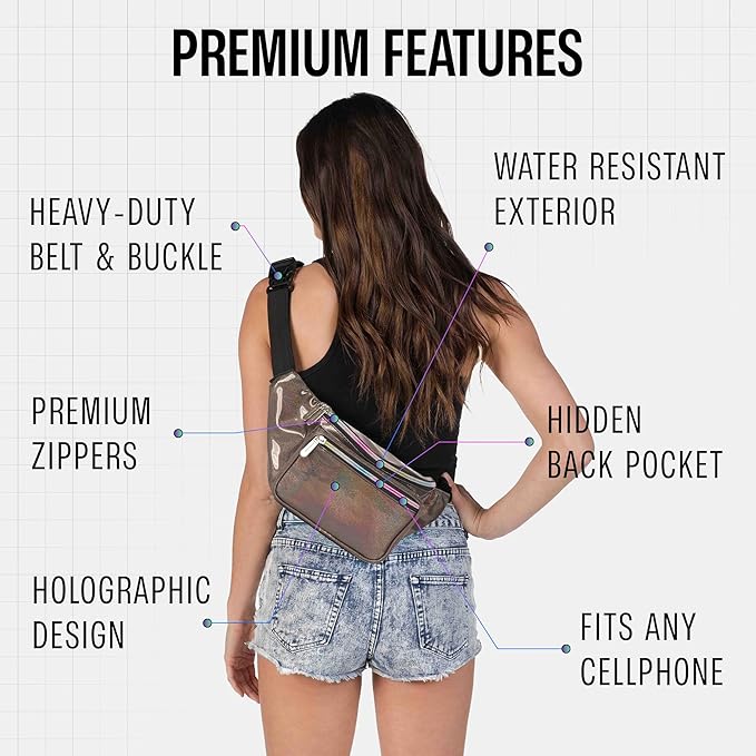 Holographic Fanny Pack Belt bag - Crossbody Waist Bag for Men or Women - Hands-Free, Waterproof Large Bumbag for Hiking, Running, and Travel (Copper Glitter)