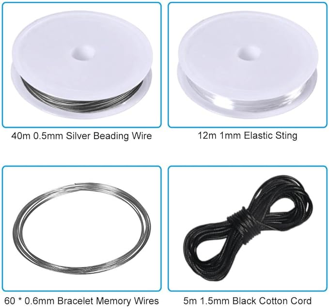 - 4 TYPES OF BEADING WIRES TO MEET THE VARIOUS NEEDS OF DIY: The jewelry tools set comes with 4 types of beading wire: black waxed cotton cord, reel of silver tiger tail beading wire, reel of clear beading elastic sting and coils bracelet memory wires. These are the necessities of making bracelets, necklaces, earrings, charms, hair accessories and other DIY projects