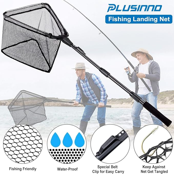 PLUSINNO Fishing Net Fish Landing Net, Foldable Collapsible Telescopic Pole Handle, Durable Nylon Material Mesh, Safe Fish Catching or Releasing
