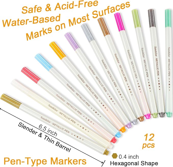 - Safe & Acid-Free - Metallic artist markers are made with water-based, opaque metallic ink. The ink is acid-free and non-toxic. Ergonomically designed, ensuring comfort even when you work with metallic color pens for a long time. You need not shake them up like most paint pens. Safe and acid-free metallic markers for kids and adults