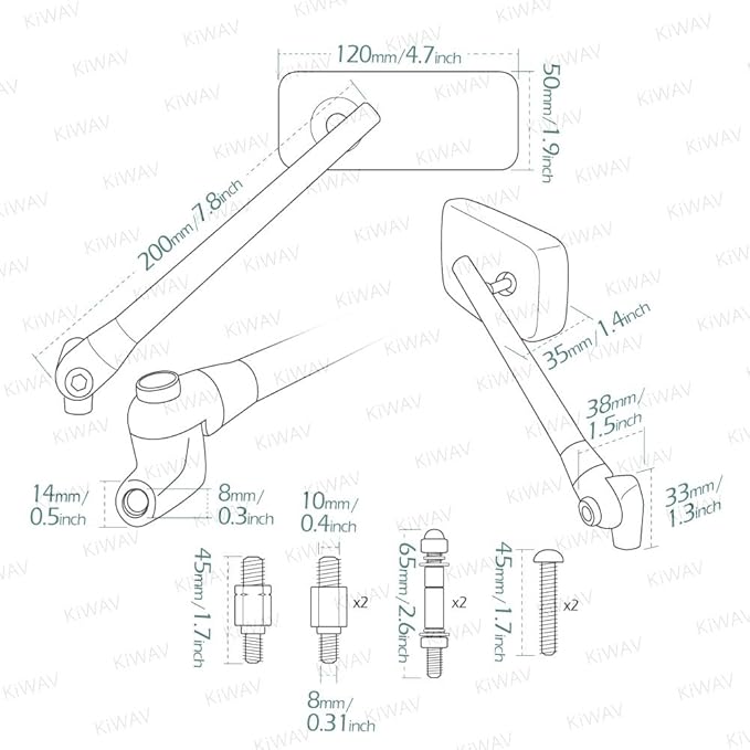 KiWAV Motorcycle Mirrors Rectangular ClassicPlus Black Convex Aspherical Anti-Glare Blue Tinted Glass Longer Stem 10mm 5/16 Inches Adapters for Cafe Racer Bobber Chopper Road Bike Pack of Pair