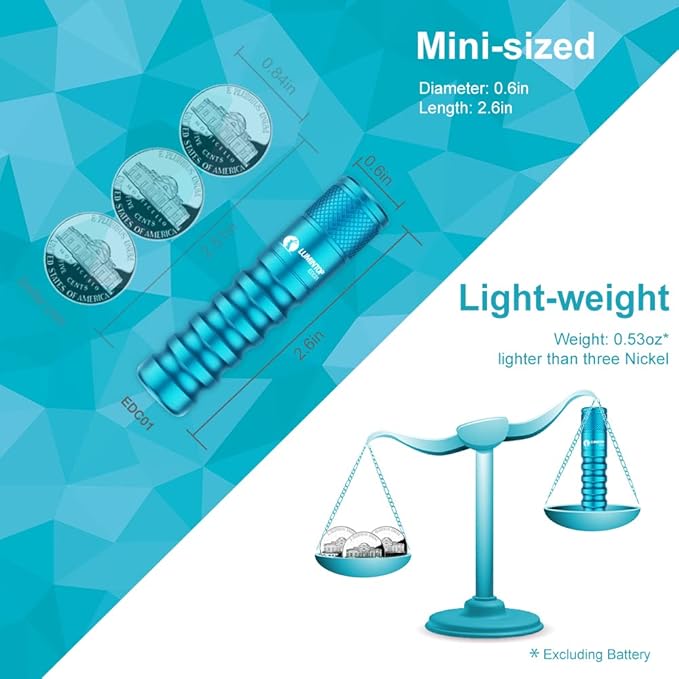 - HOW COMPACT: Military grade (HA-III) anodized surface, Aircraft-grade aluminum body, lighter than 3 Nickel (weight:0.42oz, excluding battery). Real compact size (2.36*0.57inch) makes EDC01 the best choice of keychain flashlights.