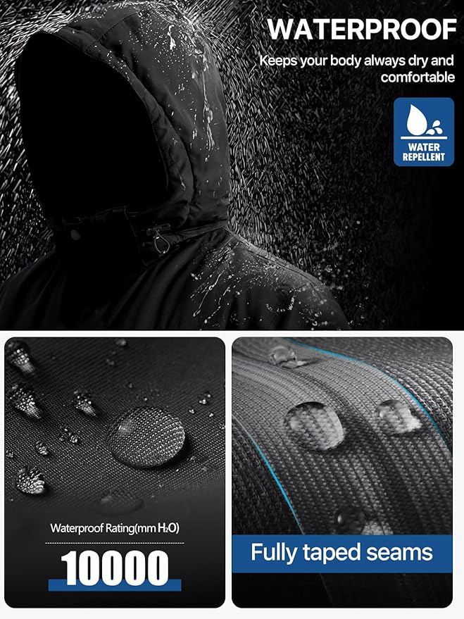 - Waterproof Ski Jacket: Durable Water-Repellent (DWR) coating that sheds rain and dries quickly, 14k waterproof rating; Fully taped seams throughout seal out moisture and provide added durability, this waterproof winter jacket will keep you dry and comfortable when you are outside, protects you from rain, snow and misty weather.