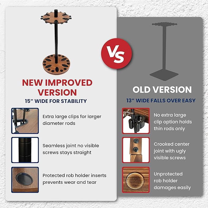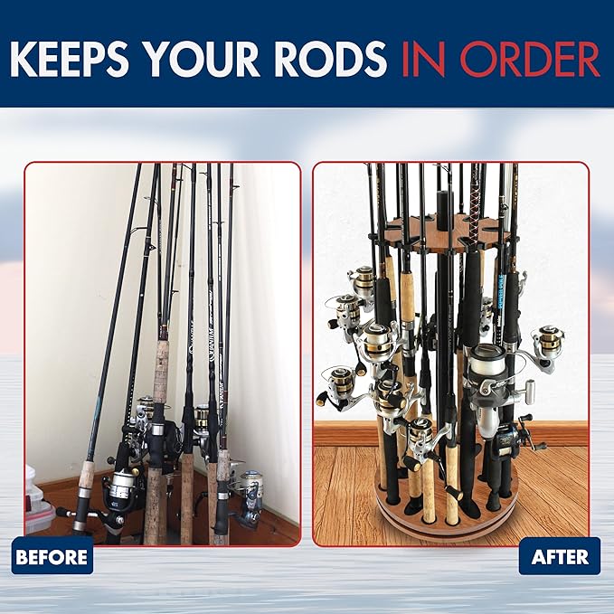 - DURABLE CONSTRUCTION: This fishing rod holder's solid wood center post is meticulously made, making it extra sturdy and reliable; providing long-term storage for your fishing gear - such as fishing poles, fishing rods, accessories, and tackle boxes.