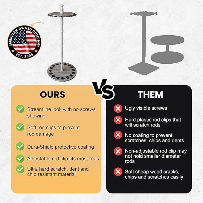 - HIGH-QUALITY WOOD CONSTRUCTION: Featuring a meticulously made solid wood center post and barnwood laminate, this 16-rod fishing rod rack is extra sturdy and reliable, providing long-term storage for your fishing gear