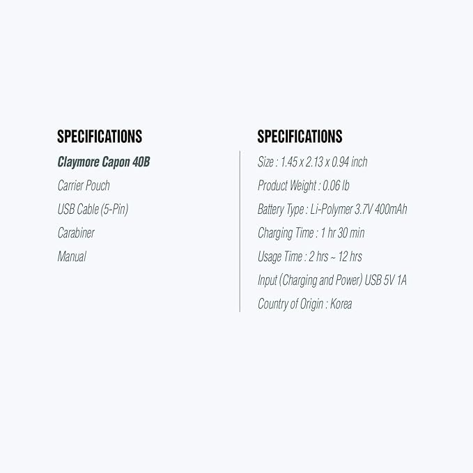 - ULTRA-LIGHTWEIGHT & USB-C RECHARGEABLE: The black CAPON 40B is ultra-light at just 29 grams and features a 400 mAh battery with USB-C fast charging. Fully recharge in 1.5 hours, perfect for everyday carry and outdoor adventures.