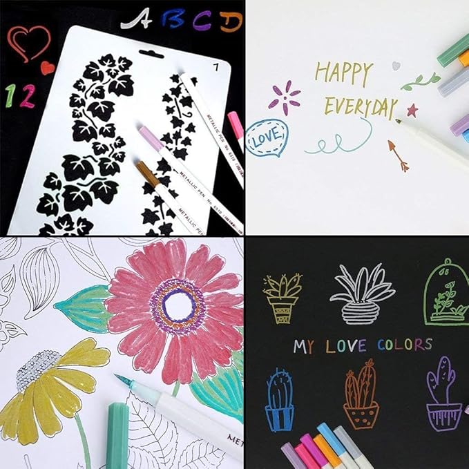 - Rich Metallic Colors - 15 assorted vivid metallic colors for opaque writing and decorating on dark and colored paper. The glimmering metallic ink will add dazzling luster to countless projects. Thanks to the metallic sparkle of the ink, the lettering and marks made will be both pronounced and eye-catching
