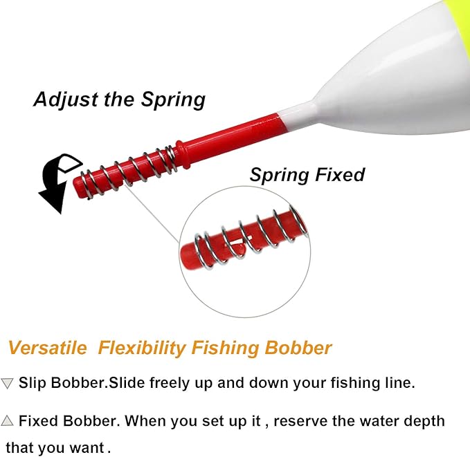 - ADJUSTABLE VERSATILE FISHING BOBBERS: Can be used as a slip or fixed float. The slip bobber rig is extremely versatile because you can adjust it to present your bait to any depth and keep your bait in the strike zone longer. It presents your bait in its most natural state. Slip bobbers also make detecting light bites much easier. The float position can be adjusted by rotating the Spring: Slide Bobbers or Fixed Bobbers.