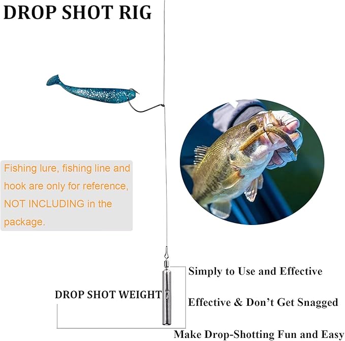 - SLENDER DROP SHOT WEIGHTS: Slender weights design makes for quiet entry when casting. Drop shot weights are designed for drop shot fishing. Slender weights work great in the rocks. The weight is dropped vertically to the bottom and the bait is lightly shaken to attract attention. Light line and spinning equipment is preferred.