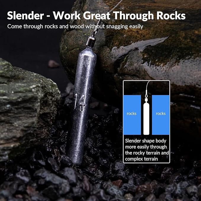 - EFFECTIVE & DONOT GET SNAGGED: Fishing Weight’s shape allows for a smooth retrieval in all bottom environments. Work great and come through rocks and wood without snagging easily. This is an excellent technique for fishing. Simply to use and effective. Make drop-shotting fun and easy. The thin pencil shaped work best in rocks, the waterdrop shape round are best on mud and sand bottoms.