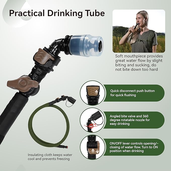 - 360 Rotatable Soft Bite Valve: You do not have to bend over or bend the tube too much, can drink easily in the normal position. On-Off valve controls the opening and closing of water flow, no water drips when valve is closed. Tube head can be dismantled for easy tube cleaning. Soft silicone mouthpiece makes the water flow fast, you can suck water simply by biting. Dust cap protects mouthpiece from dust and dirt.