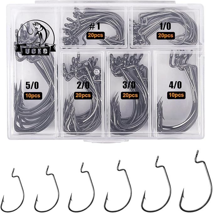 UCEC Fishing Hooks, 140PCS/ 100PCS/ 60PCS EWG Offset Worm Hooks Bass Hooks Wide Gap 2X Strong Senko Bait Texas Rig Jig Fish Hooks for Bass Trout Saltwater Freshwater Size:#4#2#1 1/0 2/0 3/0 4/0 5/0