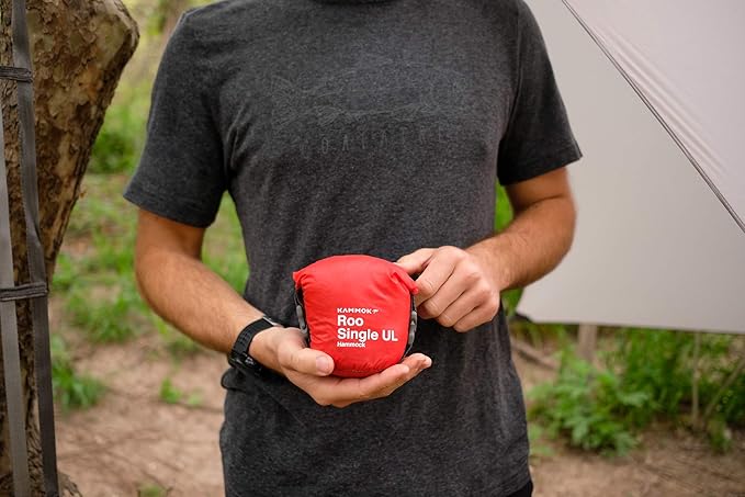 - COMPRESSED PACKING: When the Roo Single Ultralight is unfurled, it provides a comfortable berth for overnight camping. Packed down, the hammock becomes truly pocket-sized in its Sil/PU coated stuff sack.