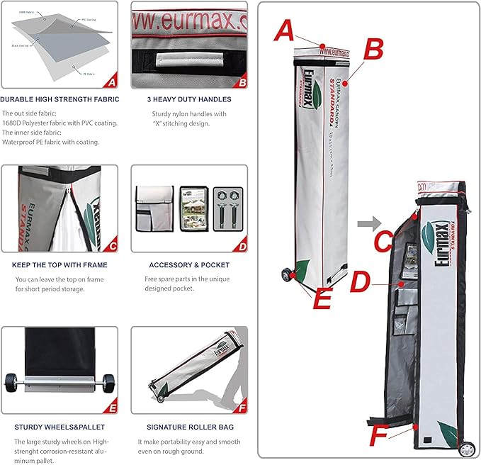 - The package includes:10x15 Pop up canopy frame + 10x15 Canopy top + 4 Removable enclosure sidewalls + Tent bag with wheels + Bonus 4 Sandbag canopy weights.10x15 Commercial pop up canopy tent for party,parties, picnics,market stall/market trade show or any outdoor events.Canopy top front valance with 4 name banner sleeve to customize and personalize your shelter. Help you attract customers.Eurmax commercial canopy tent suitable for both sunny and rainy days.