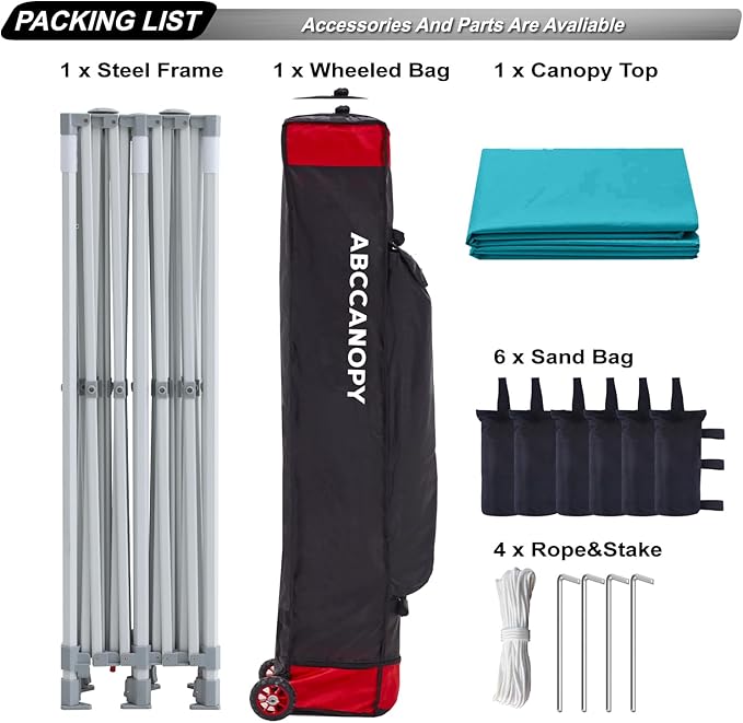 - [Highlight and Technology] (1)Special designed peak tensioner design, lift the top higher to ensure the top tight and firm. Will not collected water in rainy days. Beautiful and Safety.(2)ABCCANOPY oversize designed roller bag allow you to easily put frame and top inside. The flexible big wheels, conveniently and smoothly. Satisfy your need and long lasting.