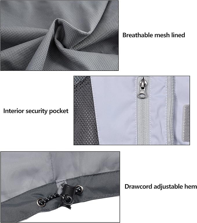 - WATERPROOF & WINDPROOF --- Superior waterproof shell fabric feature with DWR Finish and full seam taped tech, this spring rain jacket performed well in windproof and waterproof, keep you all-day dry in overcast and rainy. Lightweight mesh lining used in core body to wick sweat away from the body.