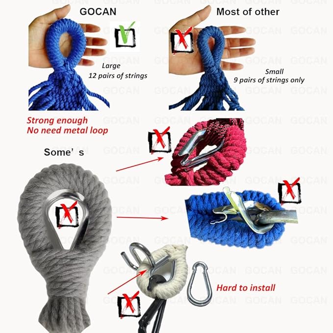 - 【3】Holds Up To 500 Lbs: The handcrafted knots at both ends and solid fabric are strong enough to holds up to 500 lbs. If you have metal S hook, don’t use it together with the metal ring of loop,Which will deform or destroy the metal ring.