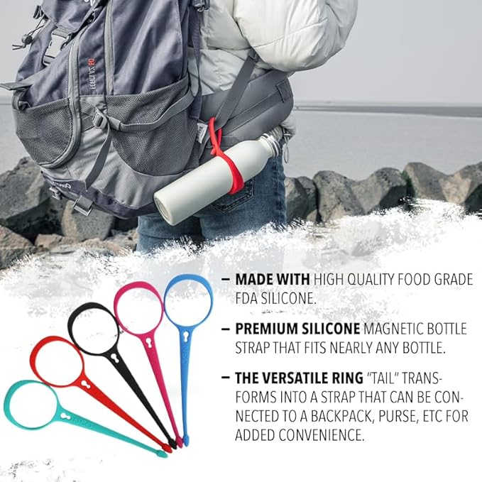 - QUICK ACCESS DESIGN: Designed for on-the-go ease, the magnetic bottle holder features a unique ring “tail” that hooks and unhooks swiftly. This means less fumbling and more time enjoying your drink, whether you're attaching it to a backpack strap or a carrier belt.