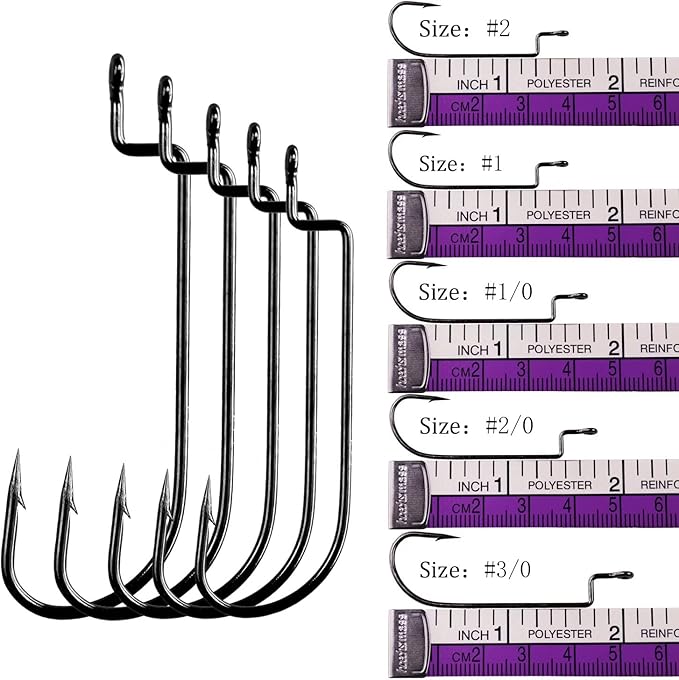 - MULTIPLE SIZES: One pack of fishing offset worm hooks contain five size, #2, #1, 1/0, 2/0, 3/0. 10pcs/20pcs each size. Please check the left size chart for the detail hook size.If you have any problem, our customer service team will solve your problem within 24 hours.