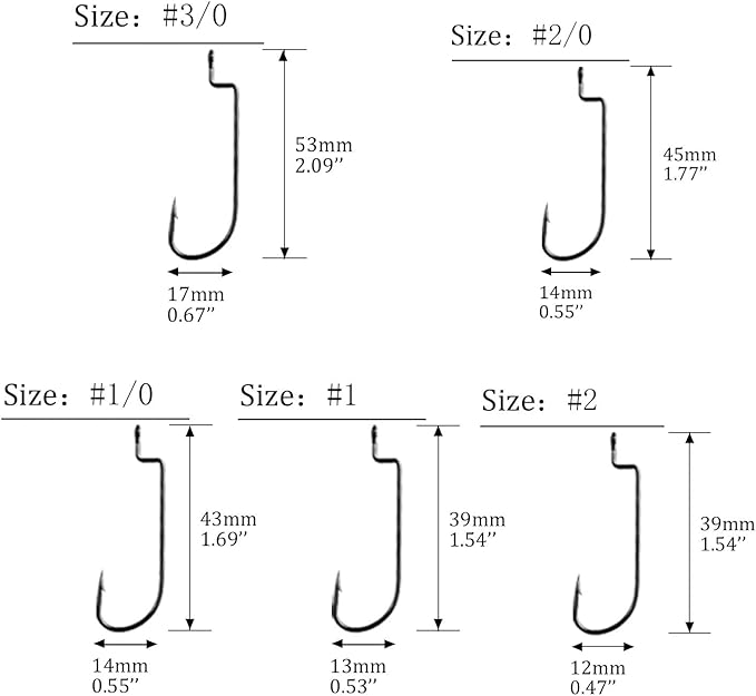 - MULTIPLE SIZES: One pack of fishing offset worm hooks contain five size, #2, #1, 1/0, 2/0, 3/0. 10pcs/20pcs each size. Please check the left size chart for the detail hook size.If you have any problem, our customer service team will solve your problem within 24 hours.