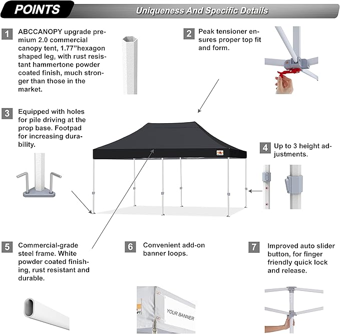 - [Special Designed Premium Grade Frame] Special thicken full steel structure, commercial grade 1.77'' (45 mm) hexagon shaped legs with hammertone powder coated finishing. Strong, Commercial and Rust Resistance. Build to withstand 50km/h of the strong wind. Your canopy will be the most durable and professional one in the market, definitely stand out from the crowd in Market stall/Market Trade Show.