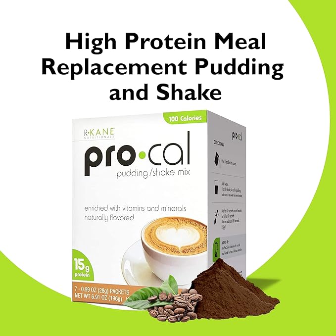 R-Kane Nutritionals Pro-Cal Pudding/Shake Mix, Low Calorie Protein Shake Powder, Meal Replacement Shakes, Mocha-Flavored Boost Drink, 15g Protein, 7 Packets per Box