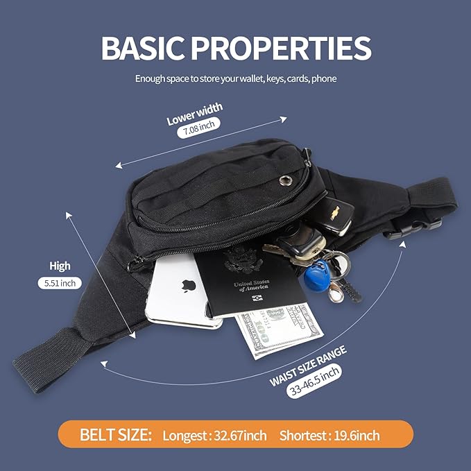 - ITEM SIZE: 14.1” L x 3.9” W x 5.5” H. Adjustable waist strap (fits up to 45”) with quick release buckle.
