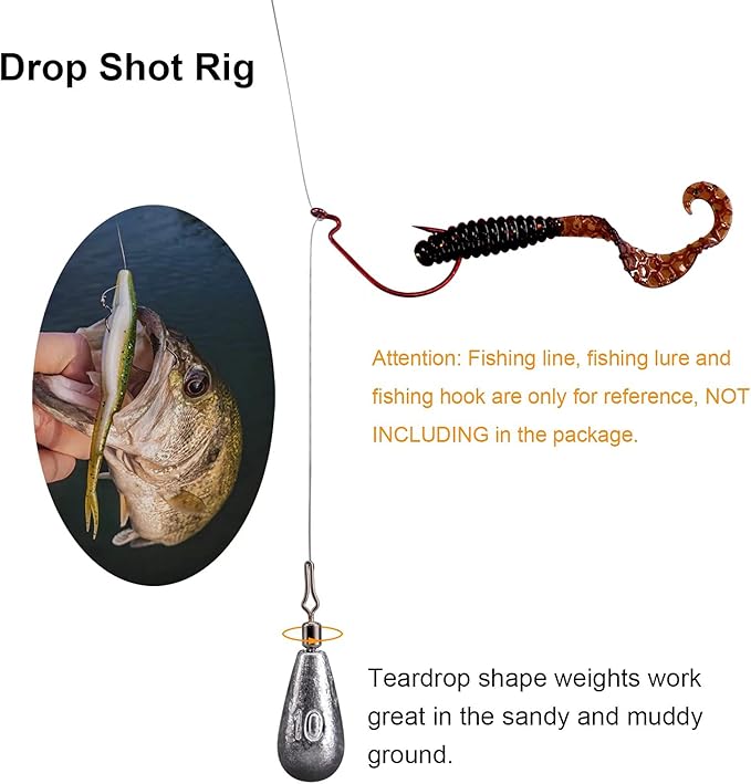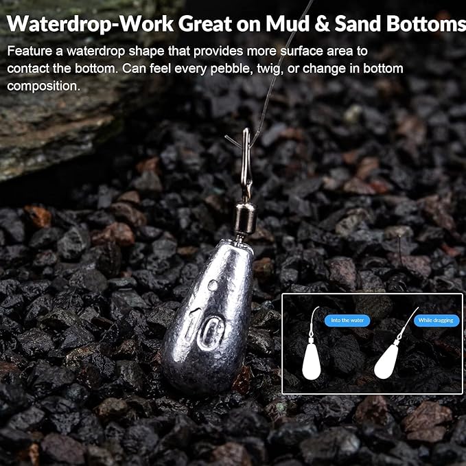 - WATERDROP & BALL SHAPE WEIGHTS: Feature a waterdrop shape that provides more surface area to contact the bottom, you can feel every pebble, twig, or change in bottom composition. Waterdrop shape & Ball shape weights work great in the sandy and muddy ground. With a pinch style line clip that allows anglers to change their weight size or leader length without ever having to re-tie.
