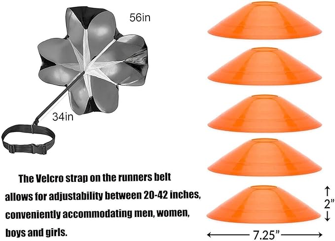 - Our soccer training equipment for kids 8-12 Includes 1 Speed Ladder, 6Agility Cones, 4 Steel Pegs, 1 Speed Parachute, 1 Parachute Bag, 1 Carry bag