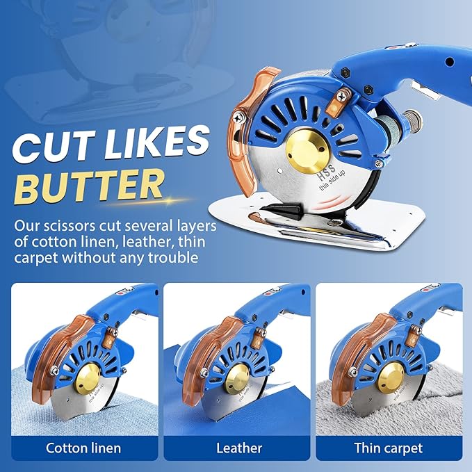 - FINISH 100+ FABRIC IN 5MINS - Our electric scissors have powerful motors and sharp blades, which can cut 10-20 layers (≤27mm/1.06inch thickness) heavy fabrics at once. Turning a several hours job into a matter of minutes especially if you need to cut a lot of fabric, such as cotton, leather, wool, silk, chemical fiber, thick carpet etc. An ideal choice for long-term working groups engaged in mass cutting fabrics!