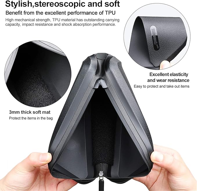 - Stable & Anti-Attrition: We are using three adjust rail systems to keep the bag in place. The straps are long enough to snug it down tight against the front tube and top tube. They are made of non-slip soft leather to reduce friction on the bike tube