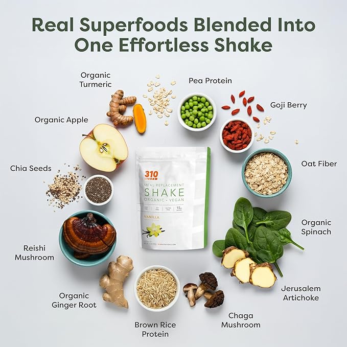 310 Nutrition Organic All-In-One Meal Replacement Shake Powder - Plant-Based Protein Smoothie Blend w/Fiber, Probiotics & Adaptogens - Low Carb, Vegan, Keto & Paleo - Vanilla - 28 Servings