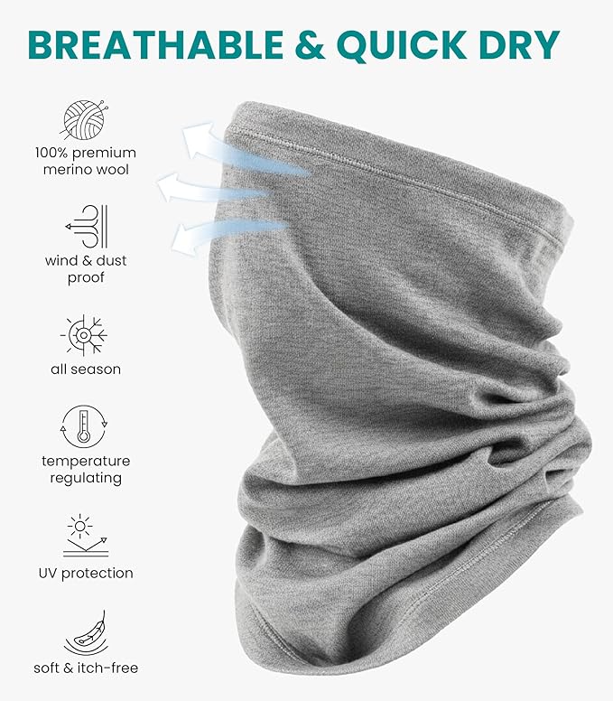 - SUPER SOFT & EXTREMELY COMFORTABLE: 100% Superfine 18.5-Micron Merino Wool Neck Gaiter provides all day comfort with no itch! The Unisex Lightweight Merino Wool Neck Warmer scarf substitute is perfect for daily wear, hiking, running, skiing, biking, camping, hunting, working, sports and outdoor activities!