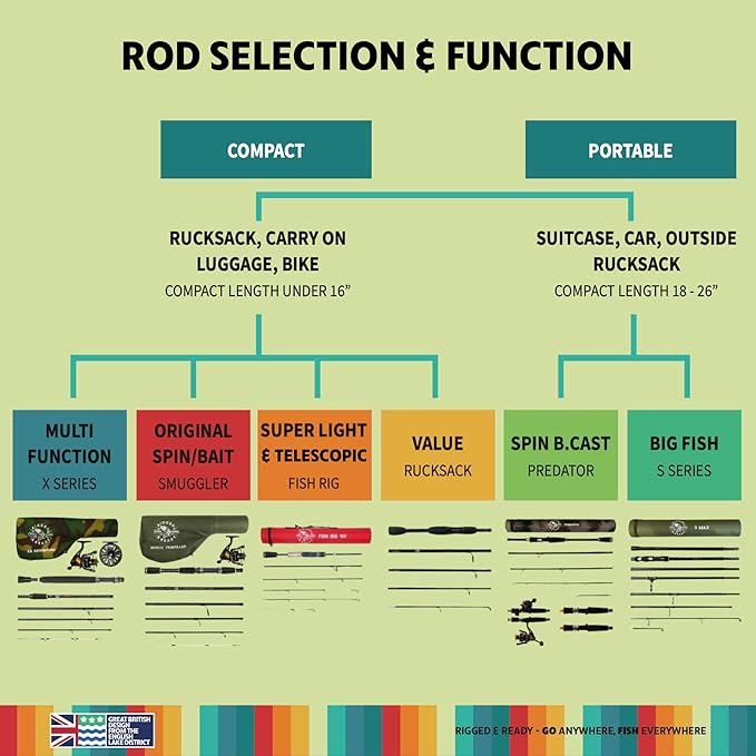 - Rigged and ready X5 MAX Powerful Travel Fishing Rod Super Compact, multi-functional travel rod. 1 Rod 9 combinations. 2.70m (8.9’), 2.45m (8’), 2.25m (7.4’) lengths. Compact 43cm 16.5’ Carry Case. Designed and tested in the English Lake District to Go Anywhere and Fish Everywhere. For spin, bait and general river, lake, beach, and sea fishing.
