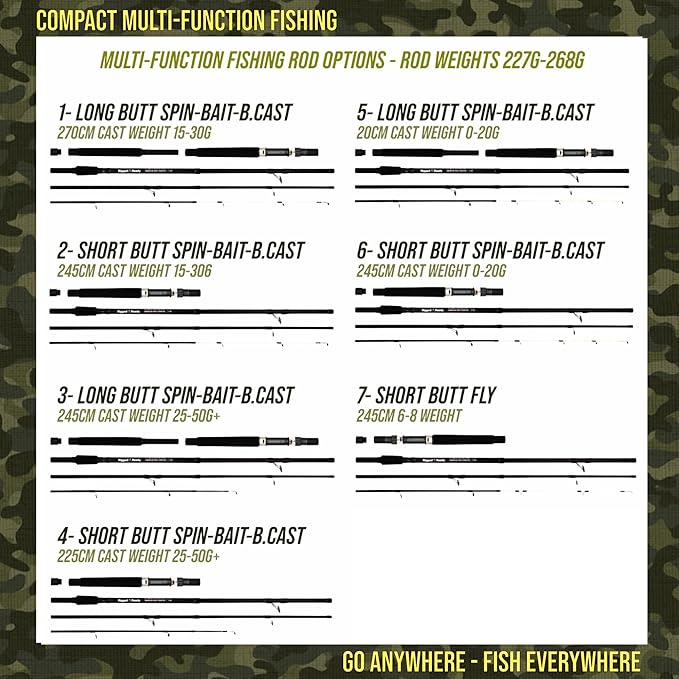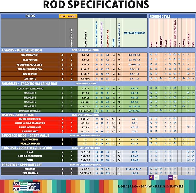 - TRAVEL READY. The rod packs down to easily fit luggage, car boots, back packs, airline cabin baggage, car, bike, caravan, motorbike, or rucksacks to Go Anywhere and Fish Everywhere. Interchangeable rods for spin fishing, lure fishing, bait casting, bait fishing, float fishing, drop-shotting, carp fishing, jigging, sea fishing and fly fishing for coarse, game and sea fishing.